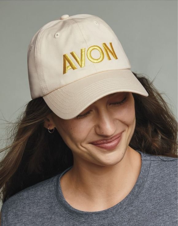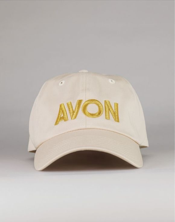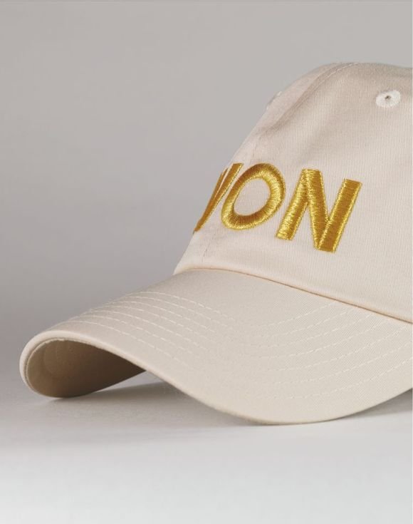Off-white unisex baseball cap with gold metallic embroidered logo, adjustable tuck-in strap and metal buckle. 100% cotton. One size fits most. Hand wash and hang dry. Imported.