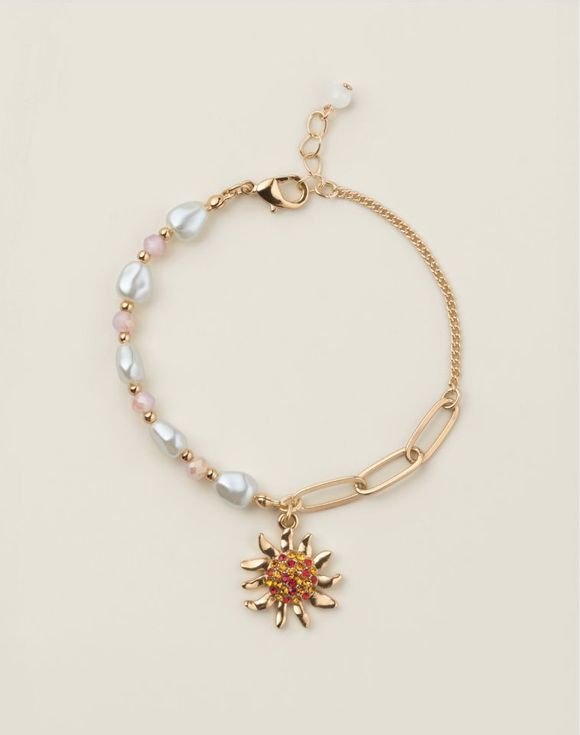 Designed to delight, this radiant bracelet features a graceful mix of pearl-like and soft pink glass beads with a goldtone paperclip style chain, accented with a sparkling sunflower motif that captures the beauty of a sunlit garden. It’s the perfect piece to bring a touch of glow and charm to any look.