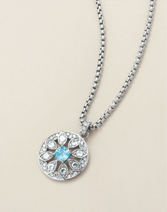 Perfect for special occasions: A striking shimmering aqua stone takes center stage in a daisy pendant composed of shimmering clear stones paired with a stainless-steel chain.