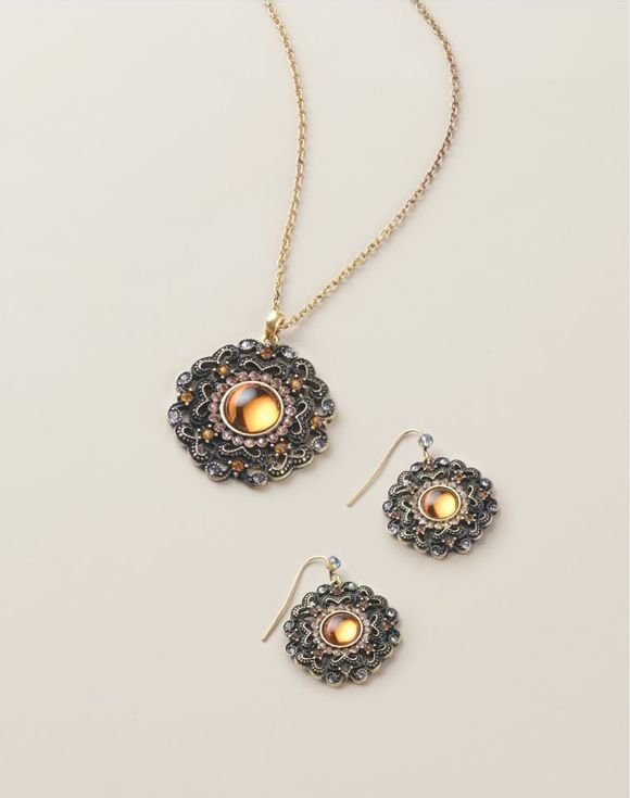 Immerse yourself in vintage romance. This polished set features intricate filigree detailing with golden and chocolate-hued stones that catch the light with a warm, timeless glow. It’s perfect for adding a touch of old-world allure to your look.