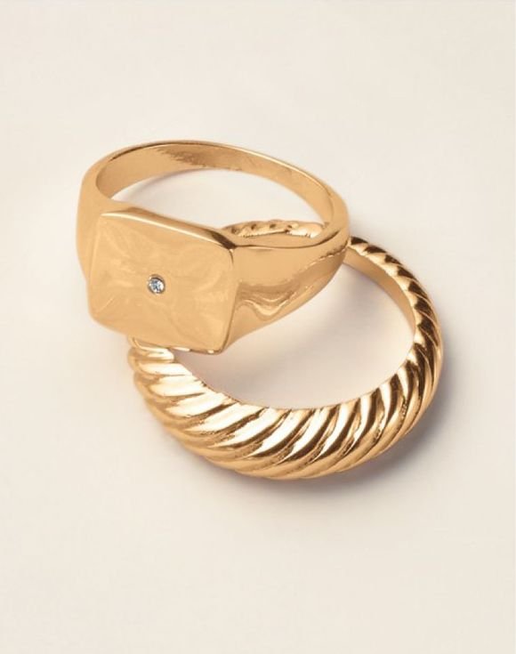 A timeless duo with a modern edge. This goldtone ring set pairs a sleek twisted rope band with a classic signet ring—once a symbol of nobility, now a statement of personal style. Wear them stacked or solo for bold elegance.