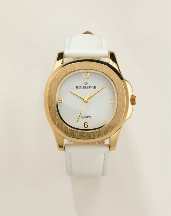 Make a statement with this sophisticated and versatile timepiece. A semi-precious white quartz dial with goldtone accents is paired with a leatherlike ivory strap resulting in a timeless look. Matching necklace, ring and earrings also available.