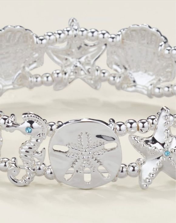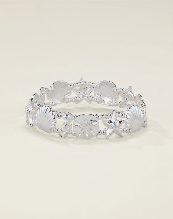 Add a carefree coastal vibe to your everyday ensemble with this stretch bracelet. Set in silvertone, this playful design showcases sea-inspired symbols including starfishes, shells and sand dollars, decorated with aqua-colored stone accents. Matching earrings also available.