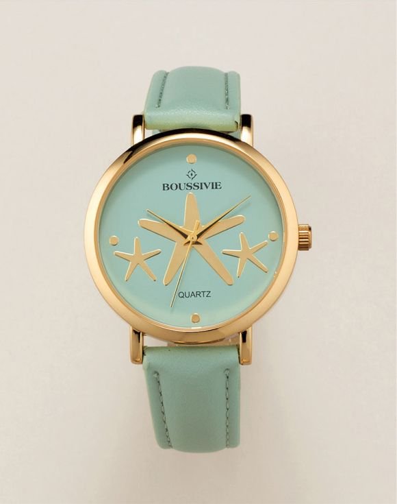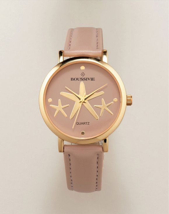 Bring coastal charm to your look with a modern timepiece. Complete with golden starfish accents and a sleek leather-like strap, it’s the perfect accessory for beach lovers. Available in two stylish shades: seafoam green and blush.
