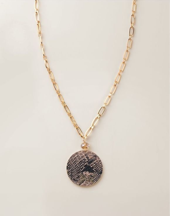 Chic, attention-grabbing and unexpectedly versatile, the snakeskin print makes a striking comeback for the season. This medallion pendant necklace showcases a snakeskin-like texture with glass accent stone. Imported.