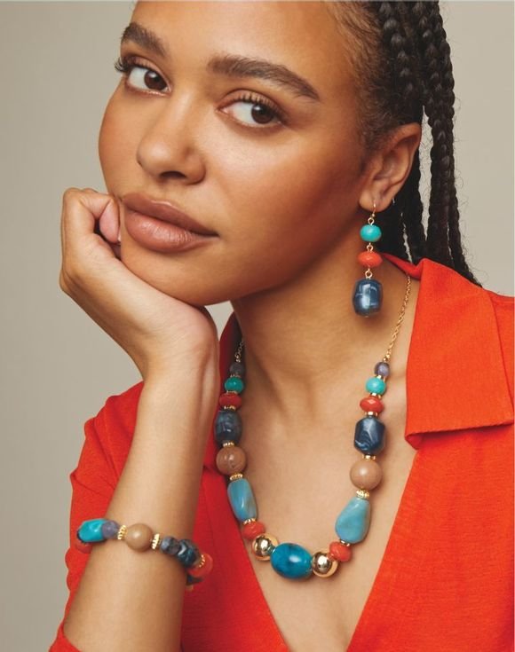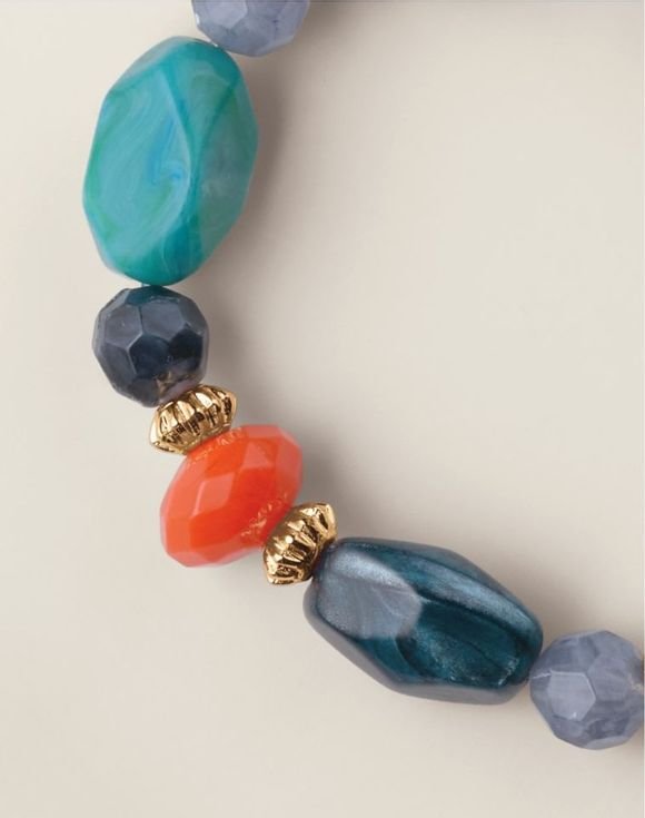 Retro vibes only. This chunky 3-piece jewelry set showcases a cool, colorful and playful palette, featuring multicolor beads with goldtone accents. Includes necklace, earrings and stretch bracelet. Imported.