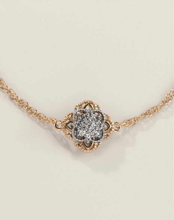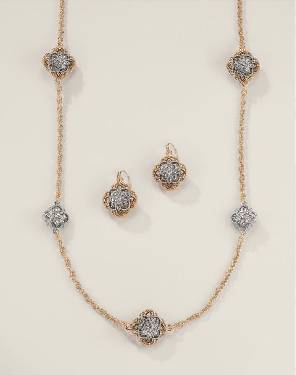 Delicate details paired with stunning sparkle combine to create an  elegant necklace and earring set that will turn heads. Goldtone chain with intricate filigree detail is adorned with quatrefoil medallions of clear glass stones set in goldtone. Matching hoop earrings and pull-cord bracelet also available.