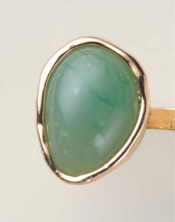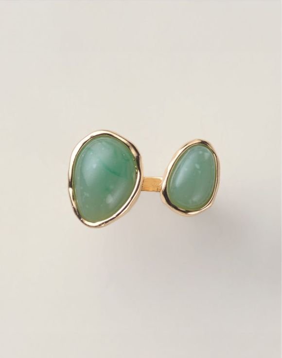 A statement of balance and beauty, this goldtone ring features two jade-like stones that face each other like twin leaves in harmony. With its open design and soft green hues, it’s both modern and timeless.