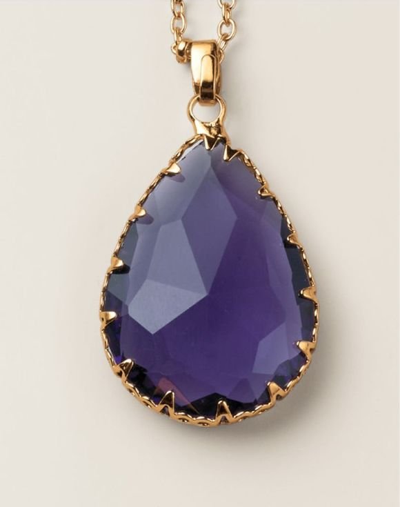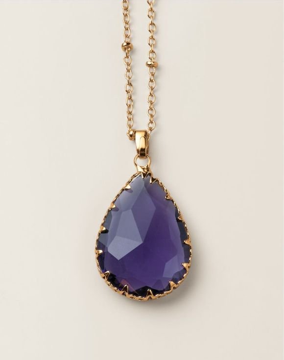 A striking violet glass pendant, shaped like a delicate dewdrop, glows against a radiant goldtone chain — the perfect pop of color to elevate your everyday style or accent your evening look with a touch of whimsy.