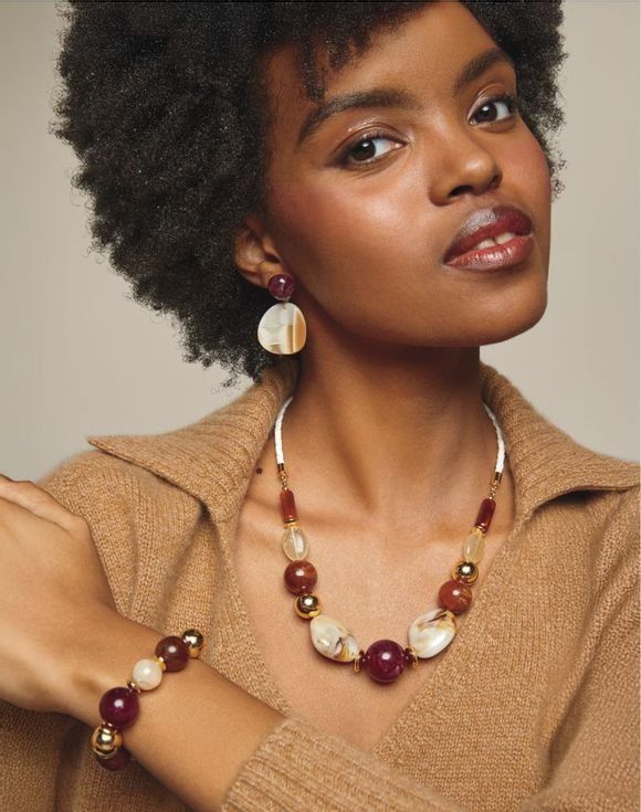 Radiate natural elegance with this beaded necklace. Featuring a rich mix of amber, rust and terracotta-inspired and goldtone beads and shell-like accents with a white leather-like braided cord, this piece brings warmth and depth to your everyday style. Imported.