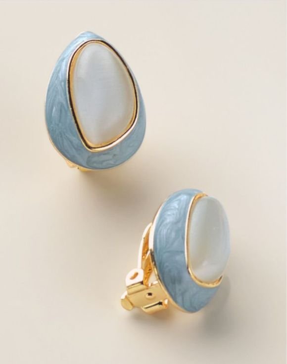 Add a touch of true-blue style day or night with these easy clip-on earrings. Light blue enamel inset with white cat-eye glass stone lend a romantic flourish.